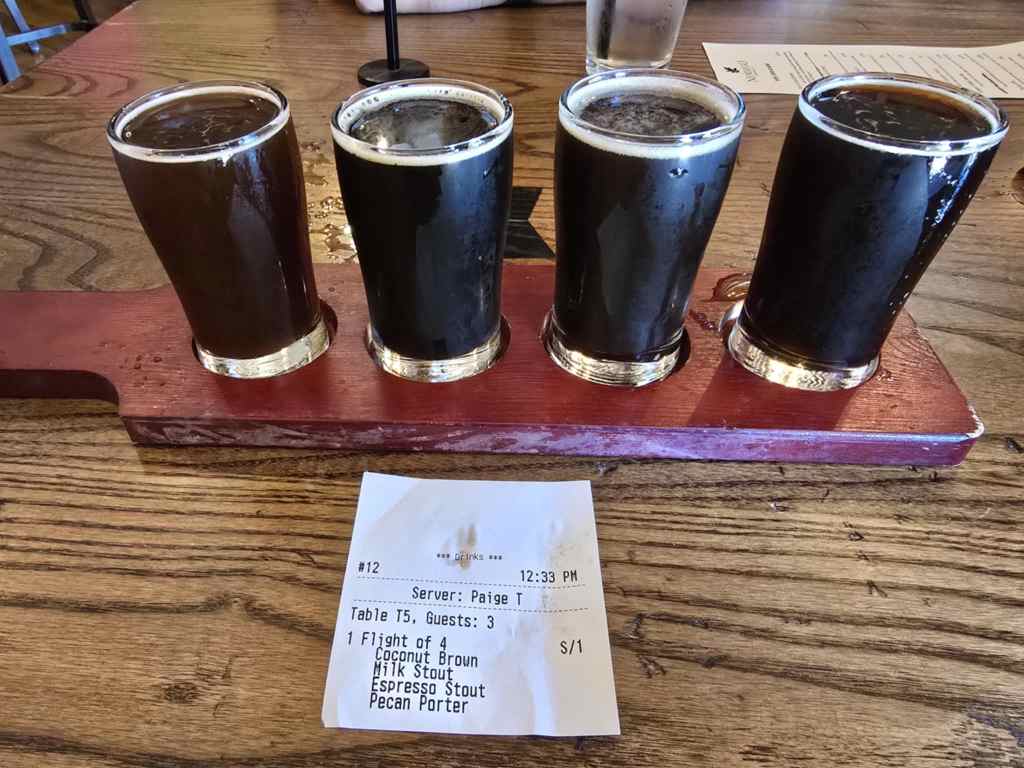 Unfortunately, the other beers fell a bit flat. The espresso stout, the milk stout, and the pecan porter were all drinkable. Would I order a full pour of any of the three? No. The milk stout tasted bland, you didn’t get any “pecan” in the pecan porter, and the espresso had good coffee flavor but simply not enough coffee in it.