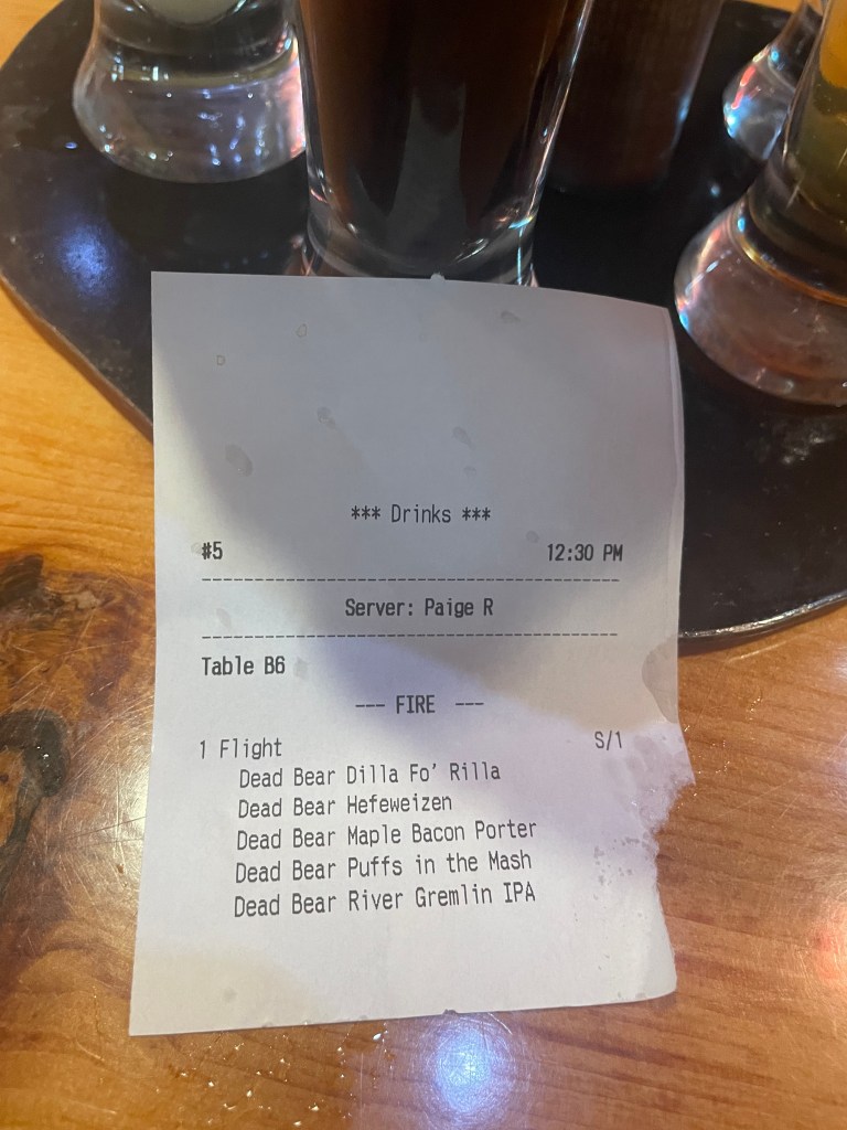 Despite having a variety of beers from other breweries, Dead Bear manages to have a fair selection of their own, including: a pickle beer, a hefeweizen, a few dark beers, and a couple IPAs. Of course, as I often do, I ventured a flight to dive into their beer.