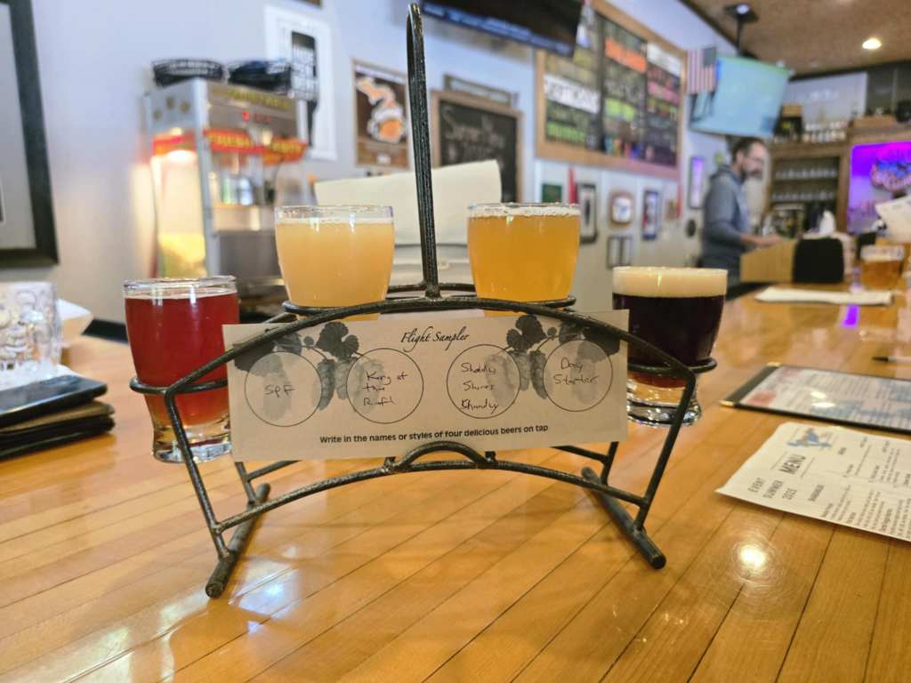 For the flight, I tried SPF (a tart Berliner Weiss cherry sour coming in at 7.5% made with Michigan cherries), King of the Raft (a Juicy hazy IPA coming in at 5.8%), Shady Shores Shandy (a 6.5% grapefruit shandy composed of their 12:00 session IPA and grapefruit soda), and Day Starter (a coffee brown ale with Nicaraguan coffee beans).