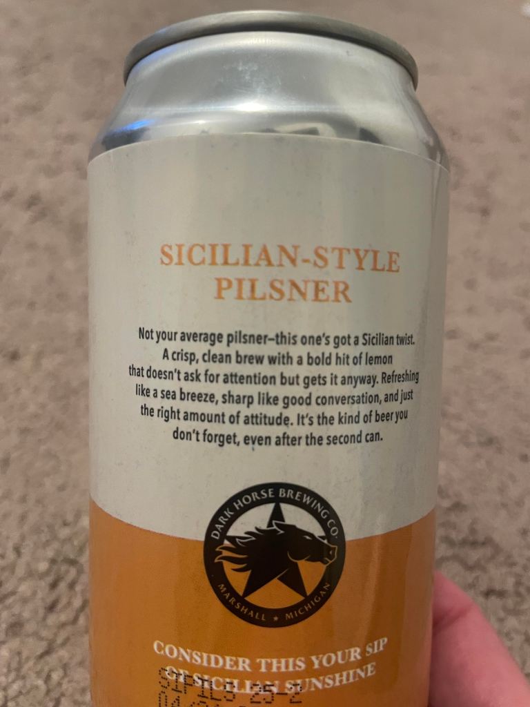 Don’t let this 4% Sicilian-Style Pilsner fool you—it’s packed with loads of flavor. The backing of the can describes it as “A crisp, clean brew with a bold hit of lemon that doesn’t ask for attention but gets it anyway. Refreshing like a sea breeze, sharp like good conversation, and just the right amount of attitude. It’s the kind of beer you don’t forget, even after the second can.”