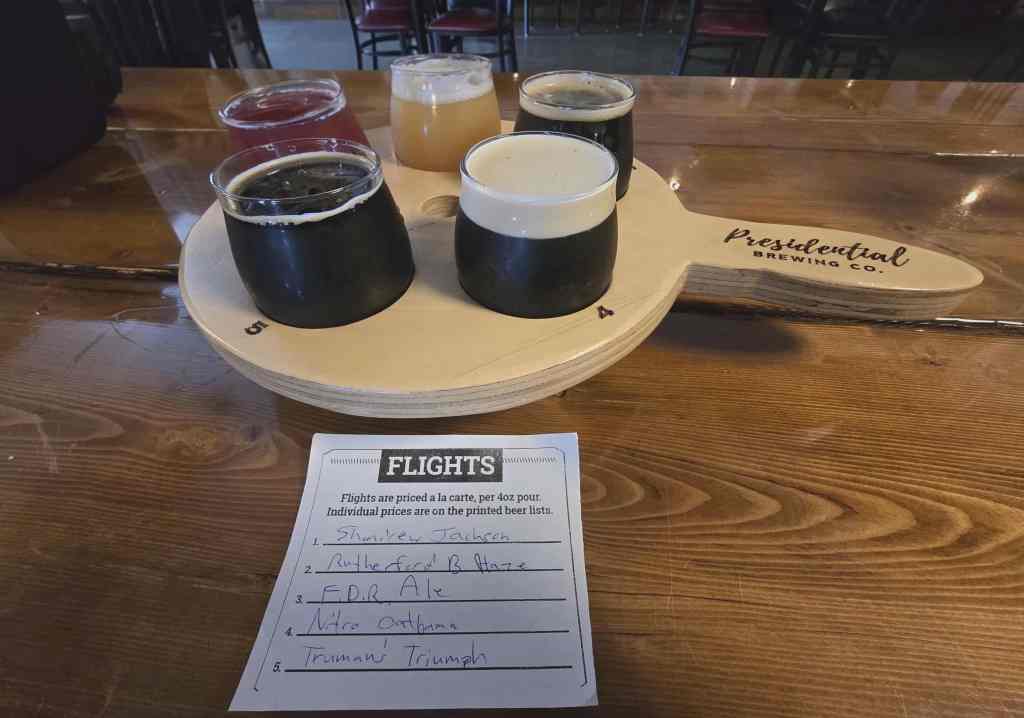 Names such as “Nitro Oatbama,” “Truman’s Triumph,” and “Sherbert Hoover” definitely stuck out. I opted for a flight of five to taste the spectrum. (Admittedly, maybe we should have snuck another hoppy beer into this rotation.)