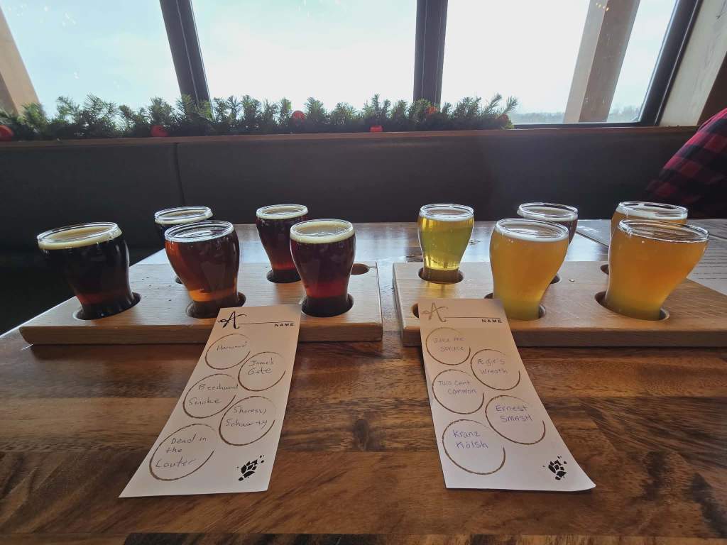 The waitress possessed much patience as my table far outstayed their welcome (about five tables arrived after us and left before us), but we hadn’t been here before and wanted to make it a day. We ordered flights, apps, entrees, and, of course, beers.